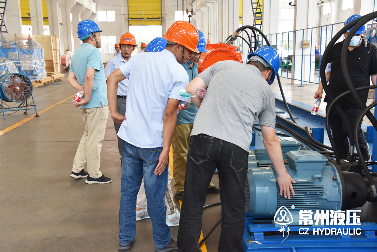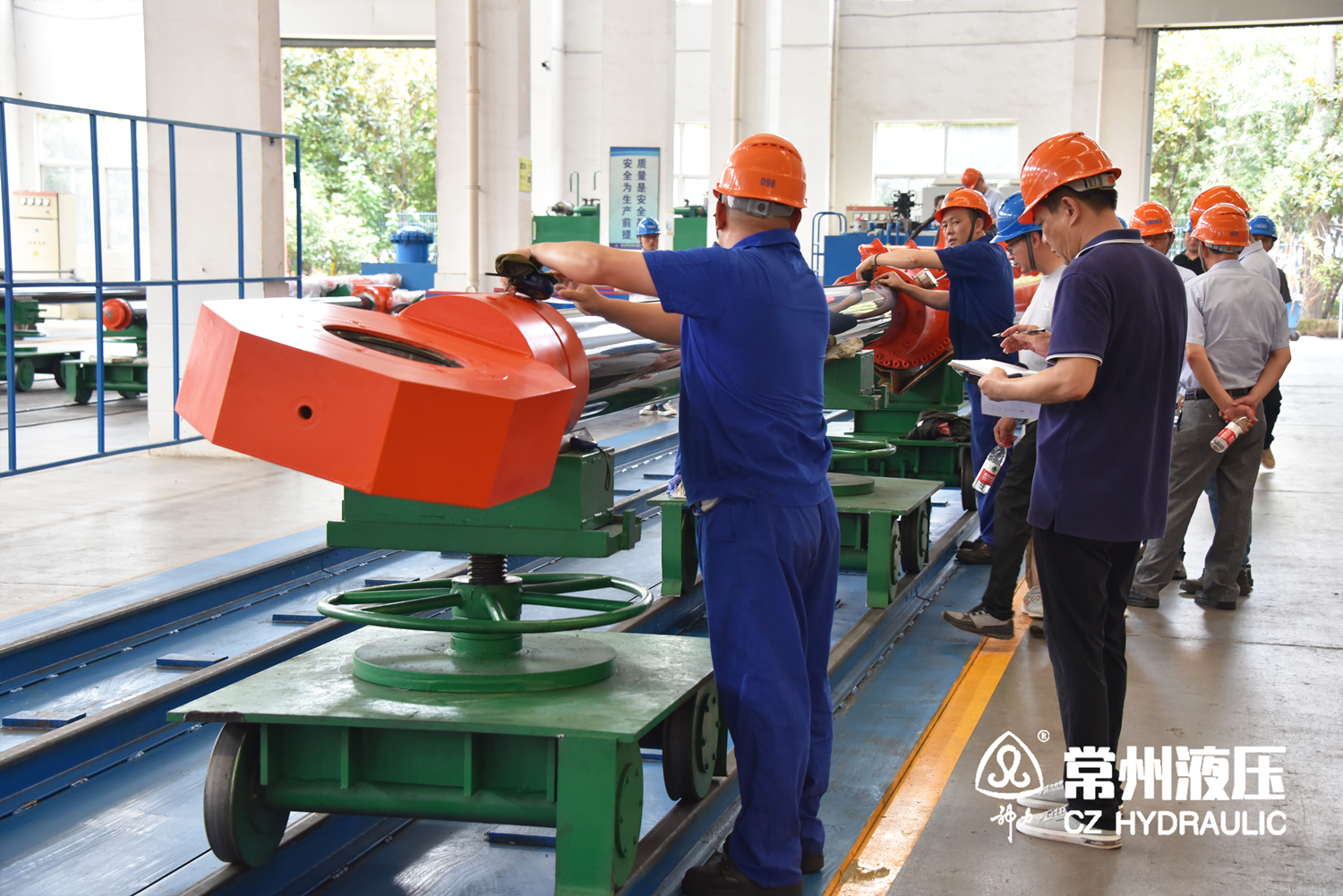 隨後,驗收小組移步生產車間。驗收現場的油缸、液壓係統與電氣係統按液壓原理圖、電氣原理圖進行聯接,模擬運行工況進行聯合調試試驗。驗收組對該套設備主要技術參數進行了檢測,見證了手動、自動運行、保護功能、下滑複位等試驗項目。